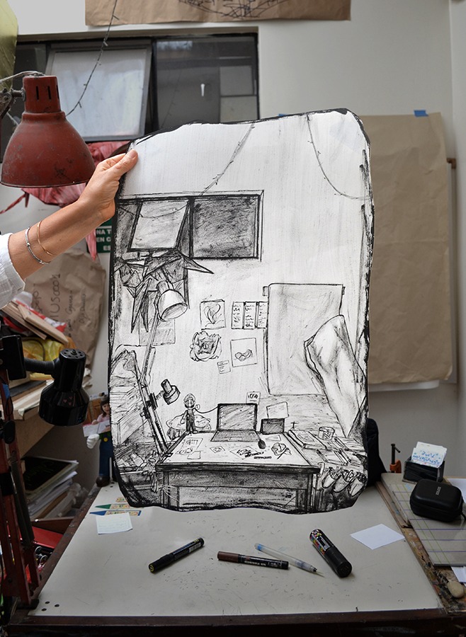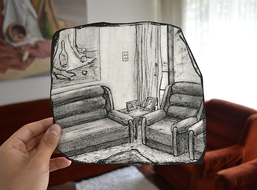 La mirada navega del cuarto al jardín, de la sala al garaje y de la cocina al taller, de la misma forma que el artista transita la casa. Los dibujos son ventanas, agujeros por los cuales se deja entrever un recorrido silencioso. Los recuerdos fueron dibujados de memoria, de manera que se la pone a prueba y se analizan los detalles omitidos, añadidos o tergiversados. Al ser imágenes del pasado cercano, se logra un detalle y fidelidad mayor a la realidad, siempre subjetiva y condicionada por la emoción y el vínculo afectivo al espacio.